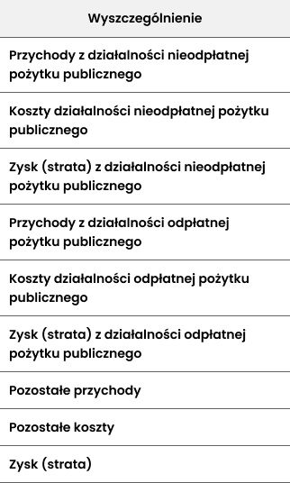 - wysokość przychodów, kosztów i wynik (zysk/stratę) z działalności nieodpłatnej,