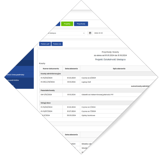 Twórz raporty z przychodami i kosztami projektów, dzięki którym Twoja organizacja będzie w stanie spełnić wymagania w zakresie prowadzenia wyodrębnionej ewidencji księgowej środków z dotacji dotyczących realizowanych zadań publicznych